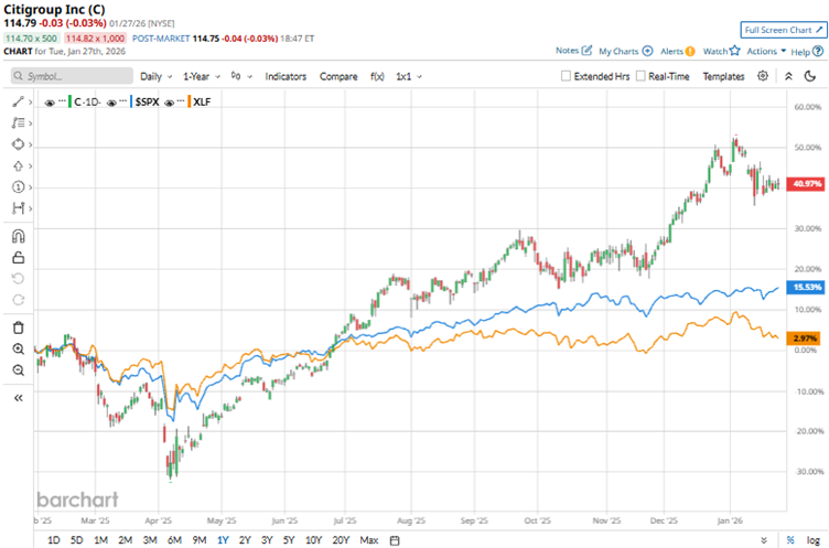 Over the past 52 weeks, the stock has gained 41.6%, while over the past six months it has risen 19.5%. Citigroup’s shares had reached a 52-week high of $124.17 on Jan. 6, but are down 7.6% from that level.