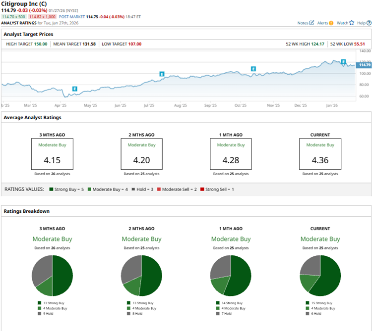 Among the 25 Wall Street analysts covering Citigroup’s stock, the consensus is a “Moderate Buy.” That’s based on 15 “Strong Buy” ratings, four “Moderate Buys,” and six “Holds.” The ratings configuration is more bullish than it was a month ago, with 15 “Strong Buy” ratings, up from 14.