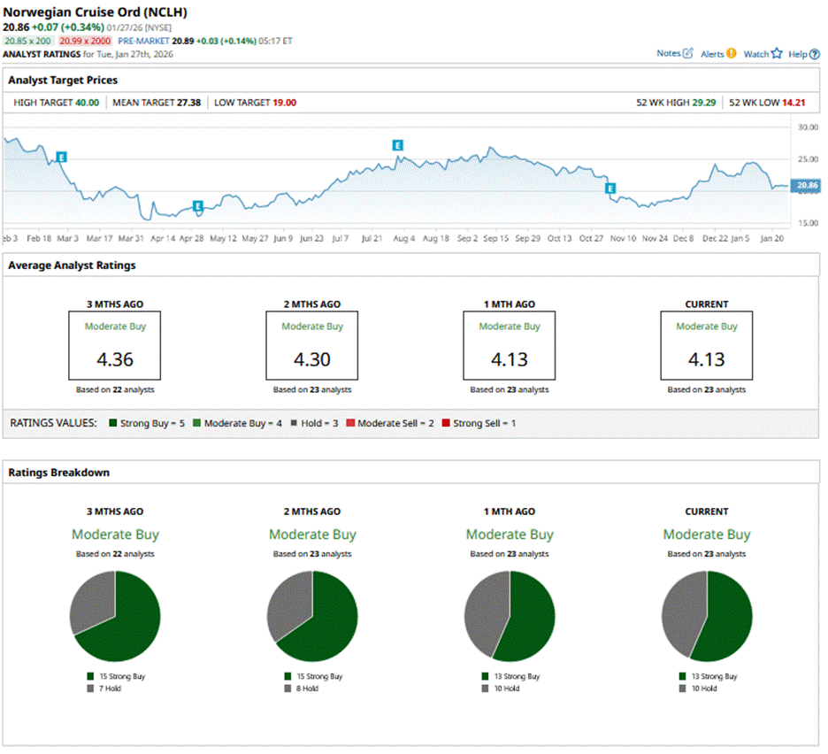 NCLH has a consensus “Moderate Buy” rating overall. Of the 23 analysts covering the stock, opinions include 13 “Strong Buys” and 10 “Holds.”