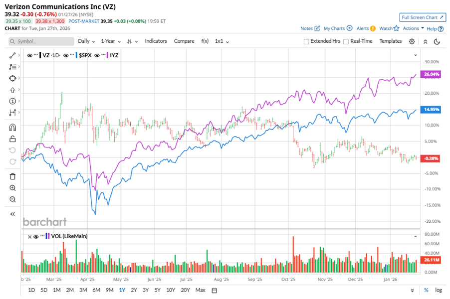 Shares of this telecommunication giant have underperformed the broader market over the past year. VZ has declined 3.3% over this time frame, while the broader S&P 500 Index ($SPX) has rallied nearly 16.1%. In 2026, VZ’s stock fell 3.5%, compared to SPX’s 1.9% rise on a YTD basis.