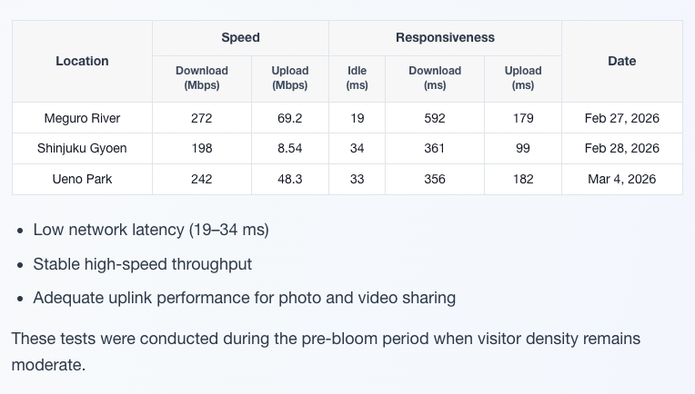 The measurements were carried out at three of the city’s best-known cherry blossom destinations — Ueno Park, Meguro River and Shinjuku Gyoen National Garden — using a local travel eSIM connected directly to Japan’s domestic au mobile network operated by KDDI.