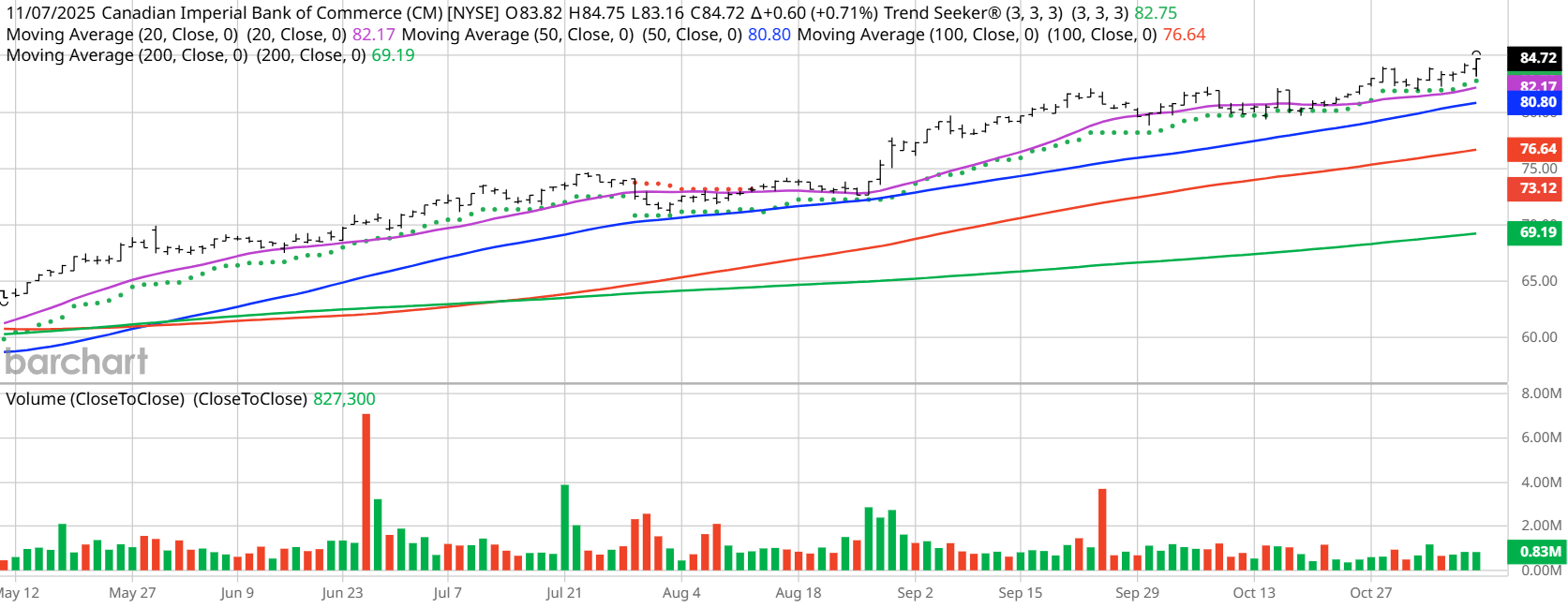- Canadian Imperial Bank of Commerce (CM) just hit an all-time high and has strong technical momentum.