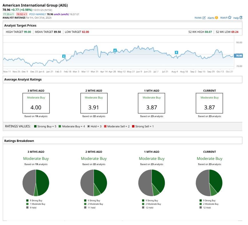 On Oct. 30, BMO Capital analyst Michael Zaremski maintained a “Hold” rating on AIG and set a price target of $83, implying a potential upside of 5.1% from current levels.
