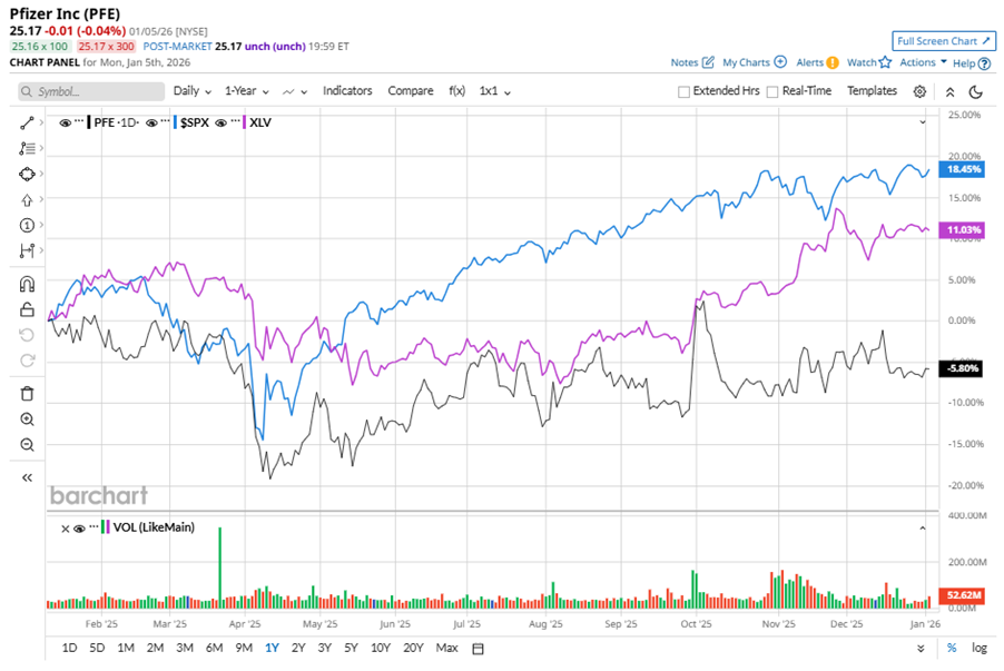 Pfizer's underperformance is due to worries about patent expirations for blockbuster meds like Eliquis and Ibrance, plus fading COVID-19 sales.