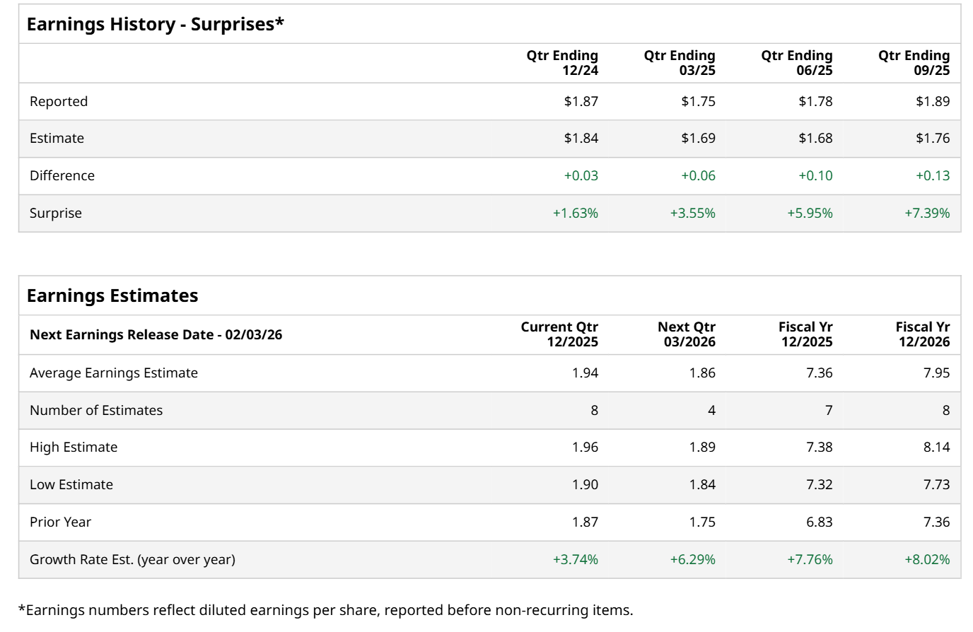 Berwyn, Pennsylvania-based AMETEK, Inc. (AME) manufactures and sells electronic instruments (EIG) and electromechanical (EMG) devices. Valued at a market cap of $48.1 billion, the company serves a diverse range of end markets, including aerospace, defense, medical, industrial, energy, and research applications. It is scheduled to announce its fiscal Q4 earnings for 2025 in the near future.