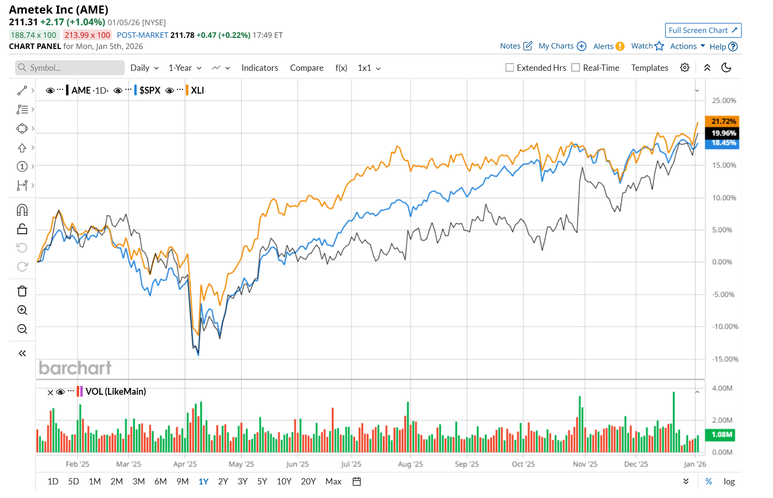 Shares of AME have surged 17.7% over the past 52 weeks, outperforming the S&P 500 Index's ($SPX) 16.2% return over the same time frame. However, it has lagged behind the State Street Industrial Select Sector SPDR ETF’s (XLI) 20.4% uptick over the same time period.