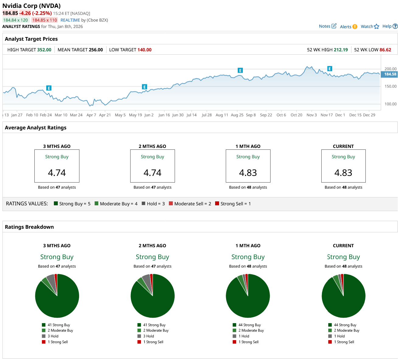 Nvidia has been in the spotlight on Wall Street for some time now, with analysts awarding it a consensus “Strong Buy” rating overall. Of the 48 analysts rating the stock, a majority of analysts, 44, have rated it a “Strong Buy,” two analysts suggest a “Moderate Buy,” one analyst is playing it safe with a “Hold” rating, and one analyst gave a “Strong Sell” rating. The consensus price target of $256 represents a 35.4% upside from current levels. The Street-high price target of $352 indicates an 86.1% upside.
