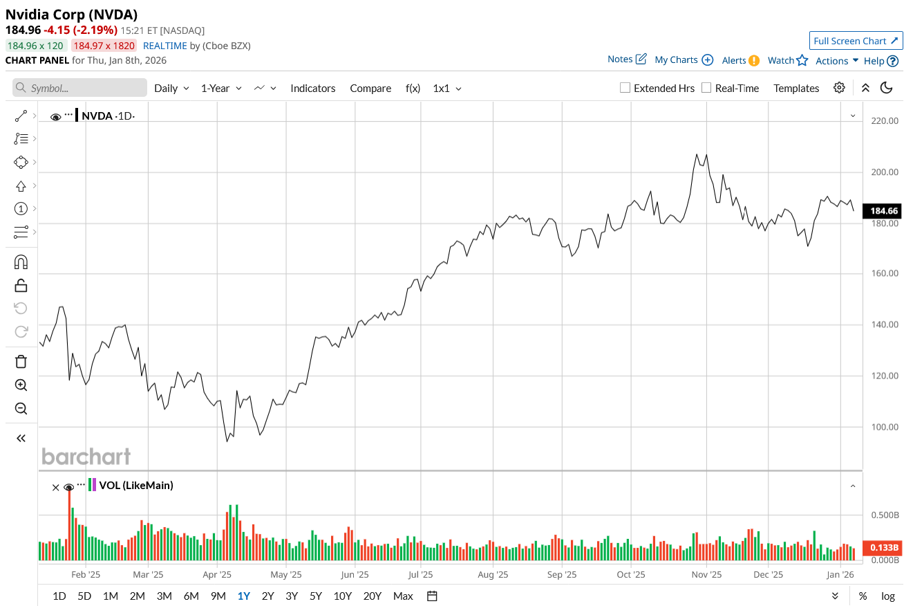 While the AI boom positioned NVDA as the leader in high-performance chips for training and inference, the stock’s performance over the past year has not been as dramatic as its earlier surge. However, the stock remains a Wall Street darling. Over the past 52 weeks, NVDA stock has gained 32%, and over the past six months, it has risen 15%. It had reached a 52-week high of $212.19 in October 2025 but is down 13% from that level.
