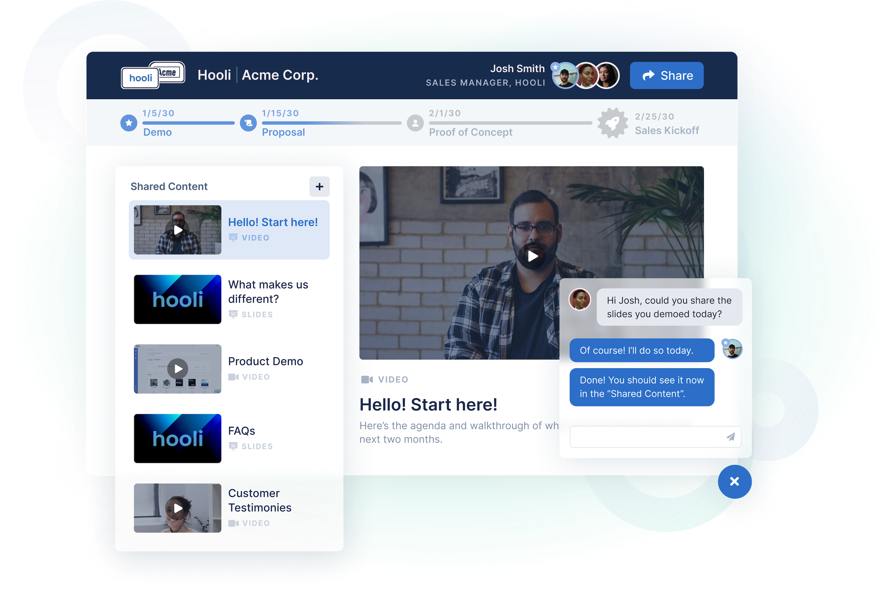 - Contact Engagement Insights: Sellers and customer success teams share content with decision-makers and stakeholders through personalized Digital Buyer Sites, measuring buyer engagement and validating buying sentiment.