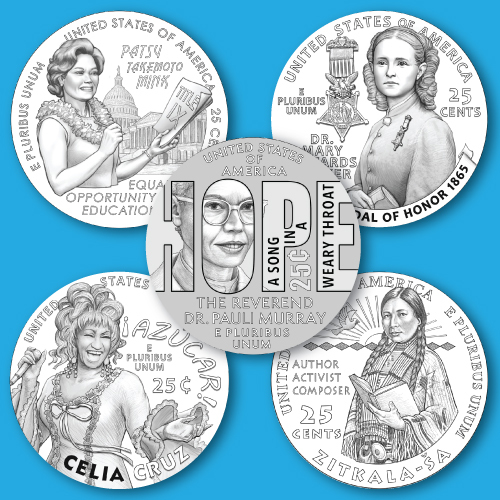 Washington, DC, July 20, 2023 (GLOBE NEWSWIRE) -- The United States Mint (Mint) is pleased to announce the designs for the third year of the American Women Quarters™ Program. Authorized by Public Law 116-330, this four-year program features coins with reverse (tails) designs emblematic of the accomplishments and contributions of trailblazing American women. Beginning in 2022 and continuing through 2025, the Mint will issue five quarters in each of these years. The ethnically, racially, and geographically diverse group of individuals honored through this program reflects a wide range of accomplishments and fields, including suffrage, civil rights, abolition, government, humanities, science, space, and the arts. The 2024 coins recognize the achievements of Reverend Dr. Pauli Murray, the Honorable Patsy Takemoto Mink, Dr. Mary Edwards Walker, Celia Cruz, and Zitkala-Ša.