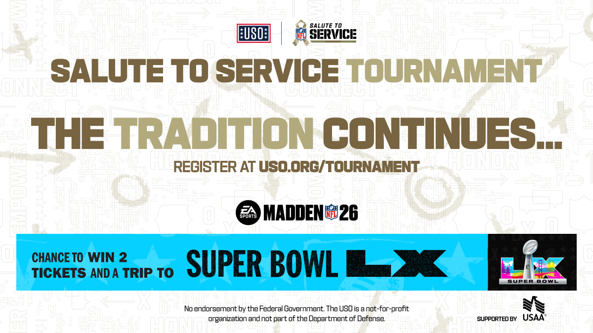 Arlington, VA, Aug. 26, 2025 (GLOBE NEWSWIRE) -- The USO and the National Football League (NFL) are joining forces to host the fifth annual Salute to Service Tournament, an EA SPORTS™ Madden NFL 26 tournament that unites the military community through the fun of football and gaming. U.S. active-duty, Reserve and National Guard members around the world are eligible to compete for the opportunity to attend Super Bowl LX. The tournament is run by the USO and supported by USAA.