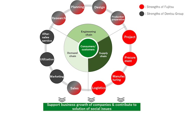 As part of their partnership, the parties aim to support efficient coordination between the three aforementioned value chains of their customers by leveraging Fujitsu's know-how in supply chain management related business systems and various supply chain optimization technologies, Dentsu's strengths in customer insights and planning and production capabilities in demand chains, and ISID's extensive experience and knowledge in engineering chains.
