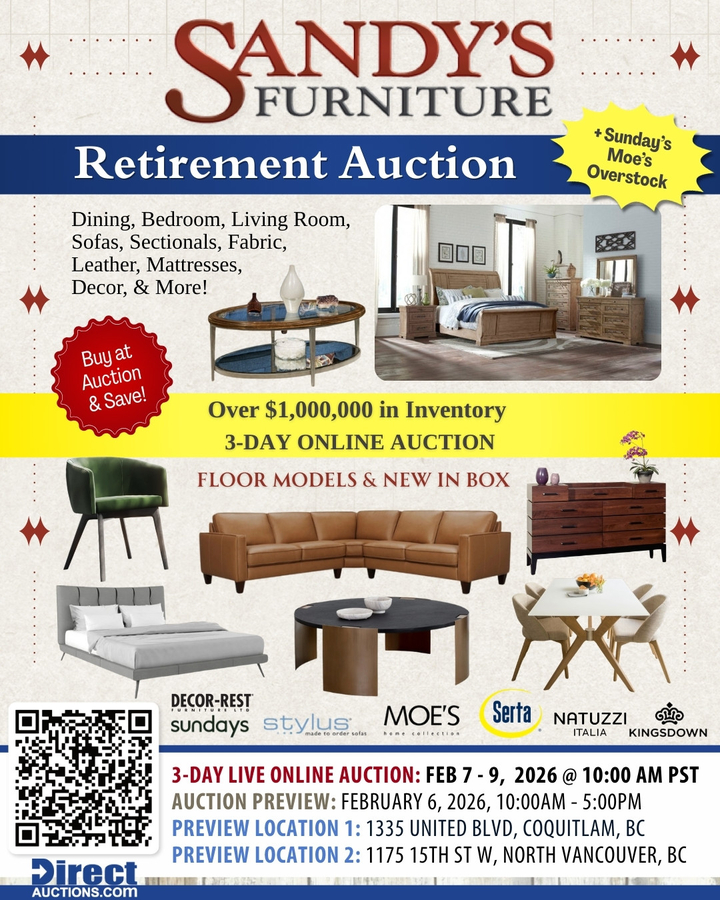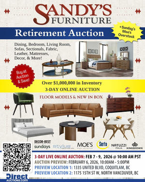 "Sandy's Furniture is a true BC success story," says Jeff Schwarz, owner of Direct Auctions and star of the hit TV series The Liquidator. "They've been a major player in the furniture industry for decades, and it's an honor for us to manage their retirement auction. This sale gives buyers access to high-quality furniture from a retailer that's built its reputation on trust and longevity."