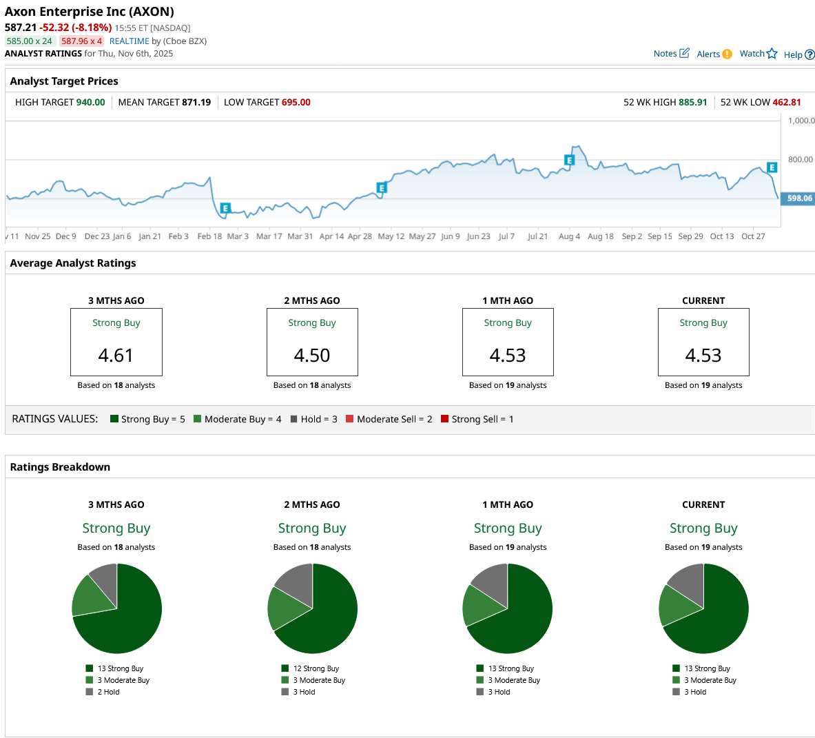 Out of the 19 analysts covering AXON stock, 13 recommend “Strong Buy,” three recommend “Moderate Buy,” and three recommend “Hold.” The average AXON stock price target is $871.19, above the current price of $587.21.