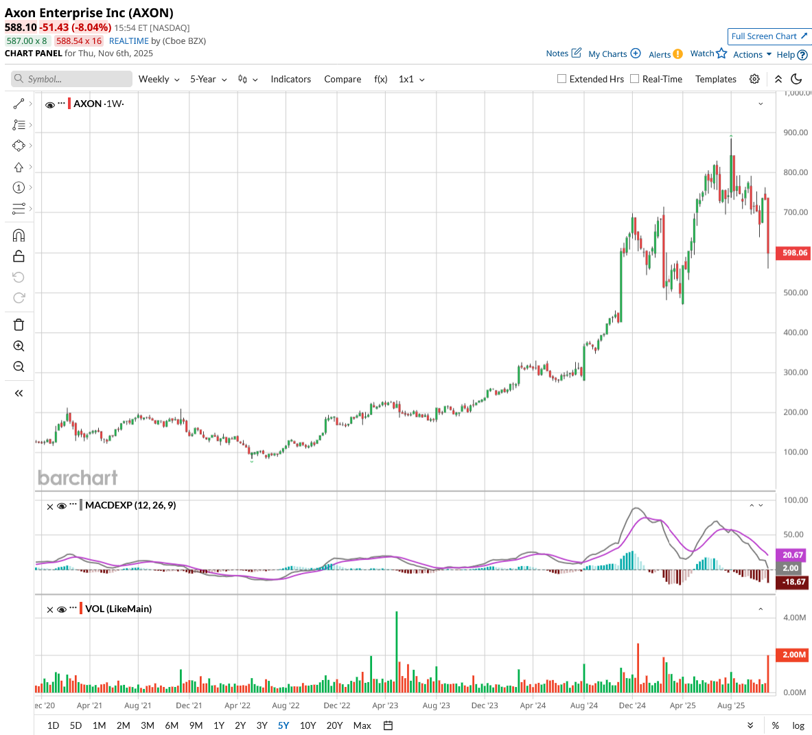 Axon Enterprise's (AXON) stock cratered 9.4% on Wednesday, marking the stock's worst single-day decline since mid-February, after the maker of Tasers and law enforcement software badly missed profit expectations despite posting record quarterly revenue. AXON stock has dropped another 8% during today's trading session.