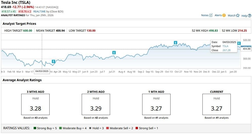 The consensus rating on TSLA shares sits at a “Hold," with the mean target of about $401 signaling potential downside of another 4% from here.