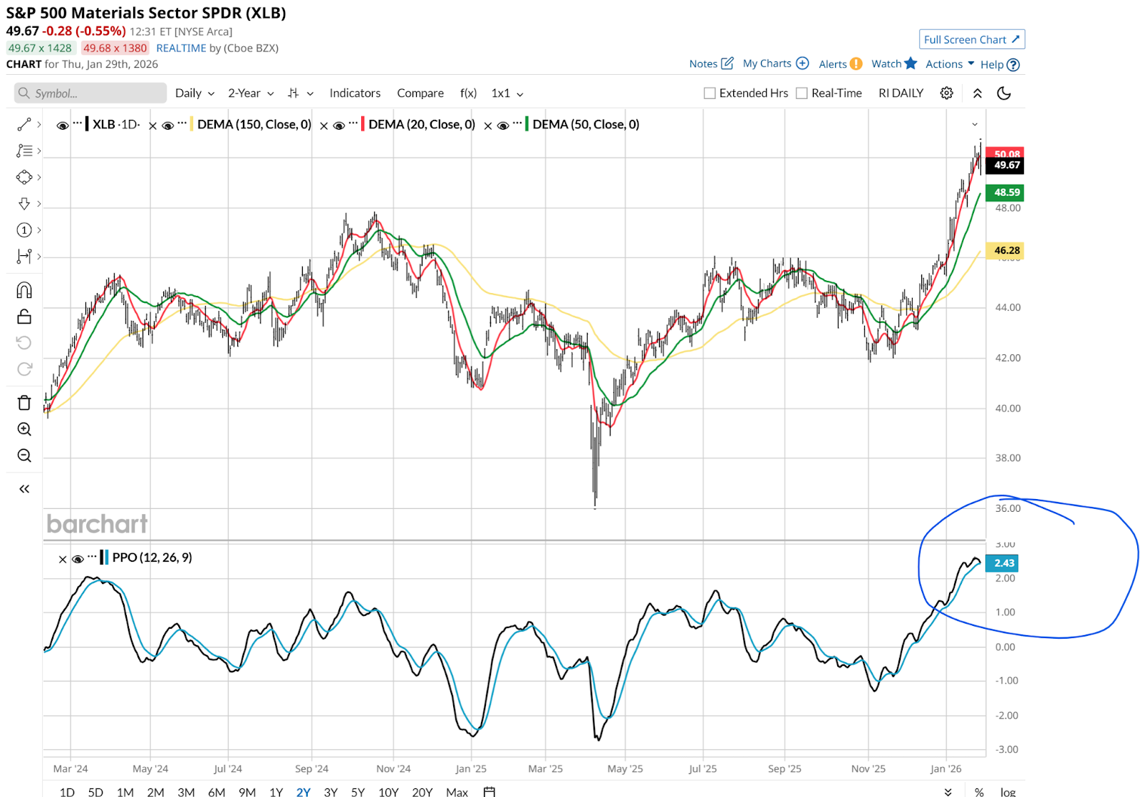 XLB tracks the companies that provide the raw building blocks for the global economy — chemicals, construction materials, and industrial metals like copper and aluminum. In a healthy bull market, you want to see these industrial materials rising alongside gold and silver.