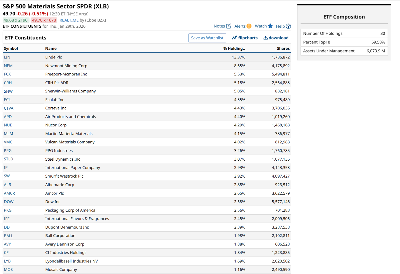 This divergence suggests that while investors are panicking into gold (GCG26) and silver (SIH26) as a hedge against a sinking dollar ($DXY), the actual industrial demand for materials is cooling. Chemical companies and construction materials providers, which make up nearly 65% of the fund, are seeing their margins squeezed by rising energy costs and slowing manufacturing data.