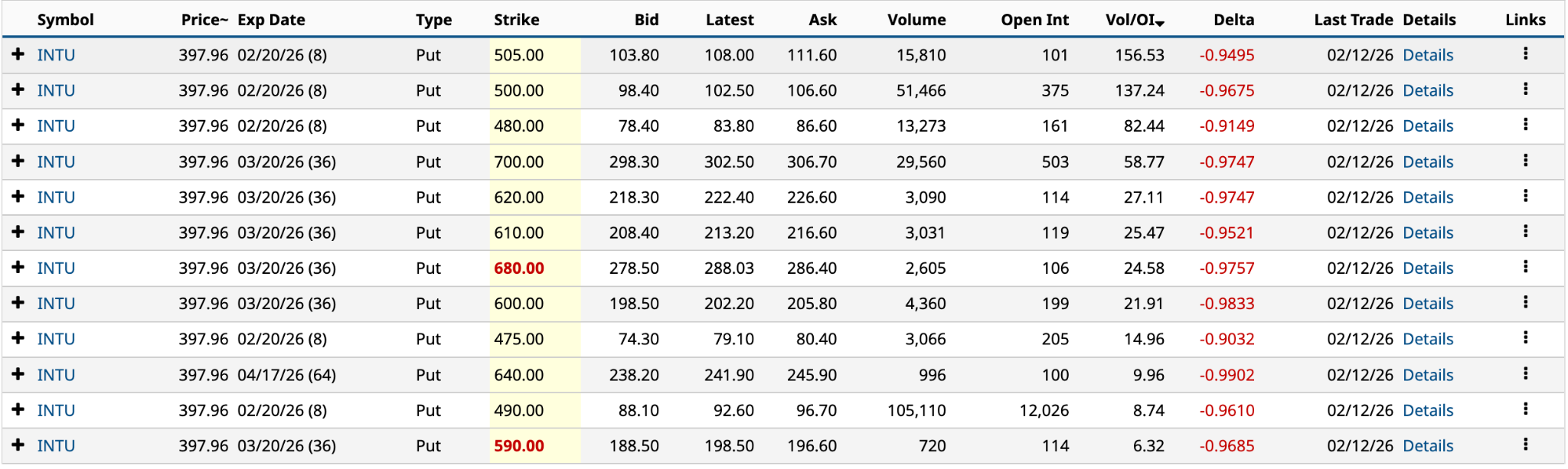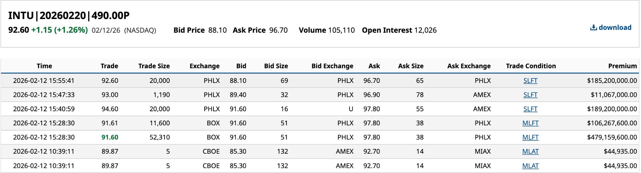 Barchart’s Options Flow page from yesterday shows Intuit’s options had a net trade sentiment of nearly $675 million. That’s very bullish. The Feb. 20 puts had 21 trades with volumes of 1,000 or higher; seven over 10,000.