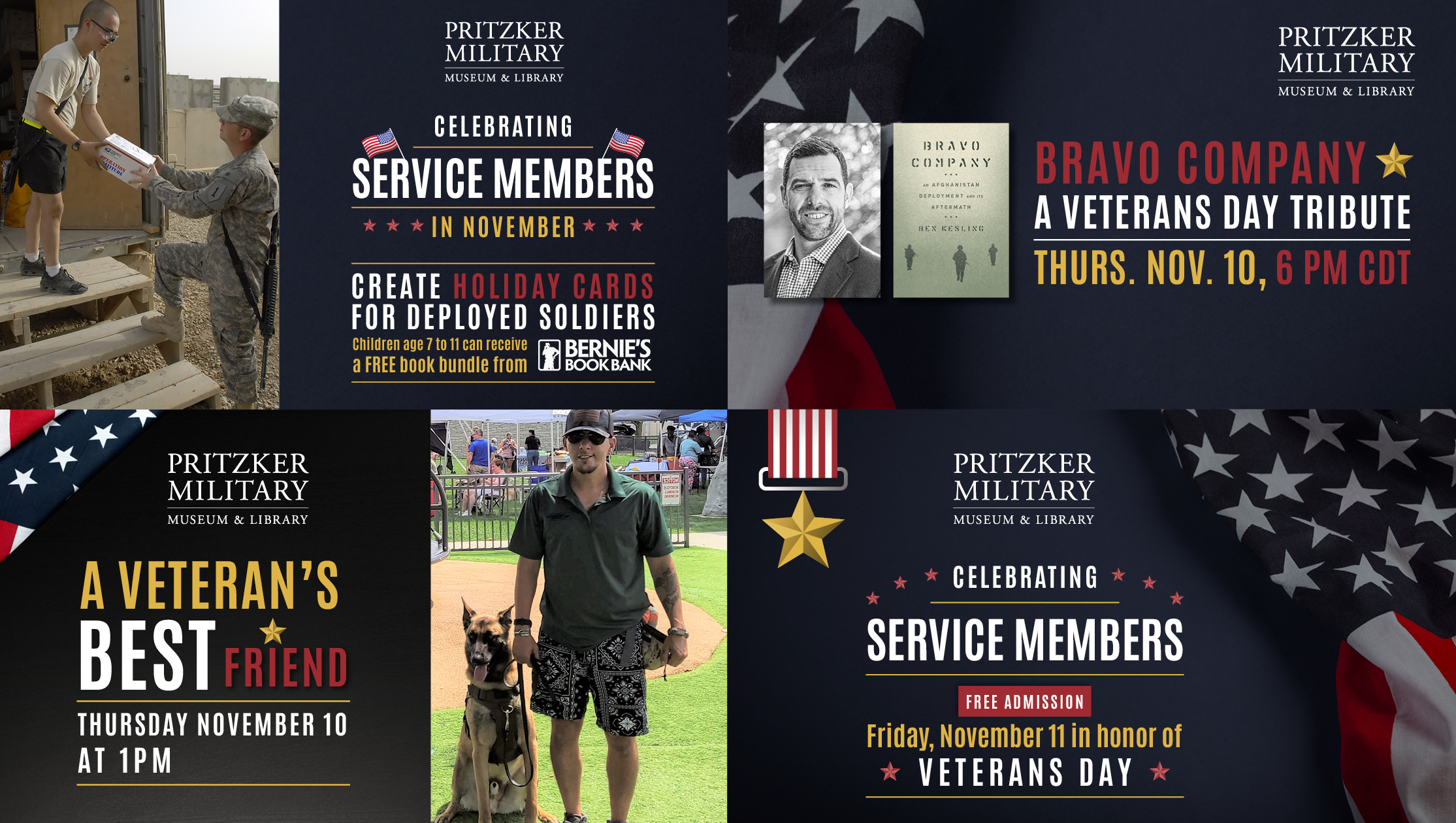 Chicago, Illinois, Oct. 25, 2022 (GLOBE NEWSWIRE) -- In honor of Veterans Day, the Pritzker Military Museum & Library (PMML) announces plans for a month-long celebration featuring free in-person and hybrid programs throughout November. Celebrating Service Members programming includes free admission to the PMML on November 10 and Veterans Day, an opportunity to send troops letters and cards with free books from Bernie's Book Bank, “Service Dogs for Veterans: Learn How Canine Companions Serve Veterans” program, as well as an author talk with Ben Kesling discussing his new book “Bravo Company: An Afghanistan Deployment and Its Aftermath.”