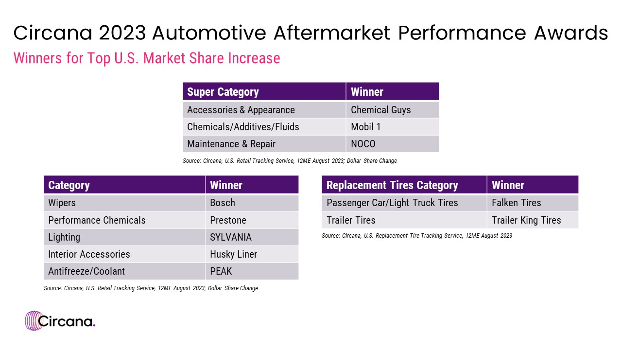 CHICAGO, Oct. 31, 2023 (GLOBE NEWSWIRE) -- CHICAGO, October 31, 2023 –Circana, formerly IRI and The NPD Group, today announced the winners of its fifth annual Automotive Aftermarket Performance Awards, which were shared with the recipients during the Automotive Aftermarket Products Expo (AAPEX) in Las Vegas. The awards recognized brands that achieved the top increases in U.S. market share in key areas of the aftermarket and tires industries.