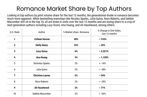 Looking at top authors by print volume share for the last 12 months, the generational divide in romance becomes much more apparent. While bestselling mainstays, like Nicolas Sparks, Julia Quinn, Nora Roberts, and Debbie Macomber still sit in the top 10, unit sales for all declined over the last 12 months and are losing share to a crop of next-generation authors, including Lucy Score, Ana Huang, and Ali Hazelwood.