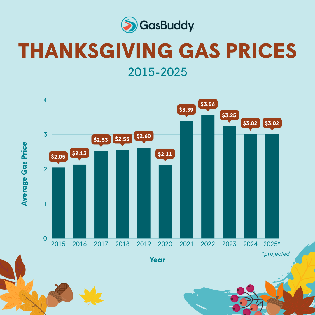 DALLAS, TX, Nov. 18, 2025 (GLOBE NEWSWIRE) -- Fewer Americans plan to hit the road for Thanksgiving this year, even as gas prices remain near the lowest holiday level since the pandemic, according to GasBuddy, North America’s trusted fuel savings platform for more than 25 years. GasBuddy forecasts a national average price of gas of $3.02 per gallon on Thanksgiving Day, matching last year and marking one of the cheapest holiday averages since 2021.