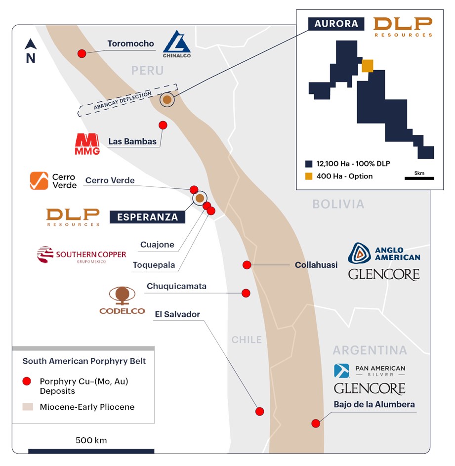 Aurora Project is an advanced stage porphyry copper-molybdenum exploration project in the Province of Calca, SE Peru (Figure 1). The Aurora Project was previously permitted for drilling in 2015 but was never executed. Thirteen historical drillholes, drilled in 2001 and 2005 totaling 3,900m were drilled over an area of approximately 1000m by 800m, cut significant intervals of copper and molybdenum mineralization. From logging of the only three remaining holes DDA-01, DDA-3A and DDA-3 and data now available, it appears that only three of the thirteen holes tested the enriched copper zone and only one hole drilled deep enough to test the primary copper and molybdenum zone (see DLP Resources Inc. news release of May 18, 2021).