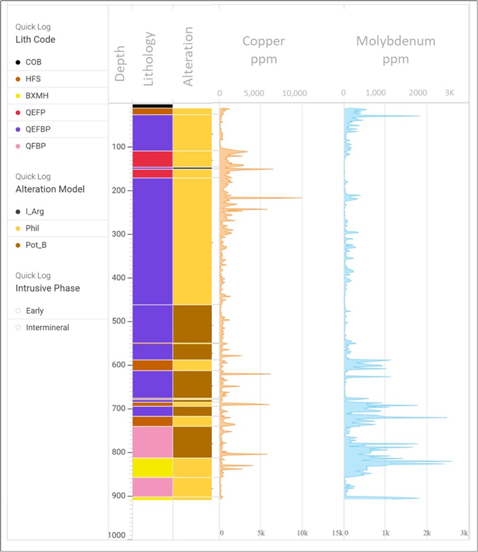 - 755.45 - 909.65m: Mineralized intermineral and early porphyry with hydrothermal breccia zone.
