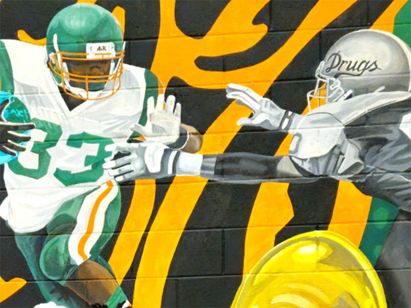 Image caption: Closeup of the mural shows Marshall Faulk (left) protecting the world from the scourge of drug abuse and addiction.